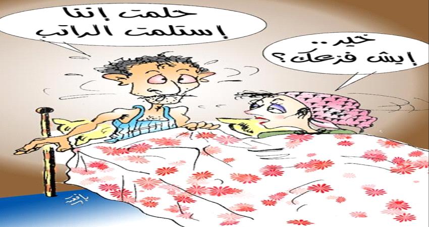 عبر الفنان الكاريتري أحمد بلفقيه بريشته عن الهاجس الذي ينتاب الموظف العام ومنتسبو الجيش والامن كلما اقترب موعد الراتب او المعاش في اليمن وفي عهد الشرعية اليمنية واصابتهم بالكوابيس والفزع حتى وقت خلودهم للراحة والنوم