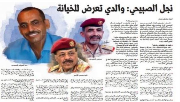 كشف نجل وزير الدفاع، محمود الصبيحي أنه لا يستبعد وجود خيانات صاحبت عملية اعتقال والده منذ أكثر من عام ، مؤكدا تعرضه لخيانة البعض في المعتقل، ولكن الوقت كفيل بفضحها، وأضاف عبدالولي الصبيحي في حوار مع صحيفة الوطن السعودية بأن هناك تطمينات عن صحة والدهم ولكنهم لم يتواصلوا معه منذ أسره وحتى اليوم، إلا عبر بعض الوسطاء الذين أكدوا أنه بصحة جيدة، مثل المبعوث الدولي، إسماعيل ولد الشيخ أحمد، وغيره..
