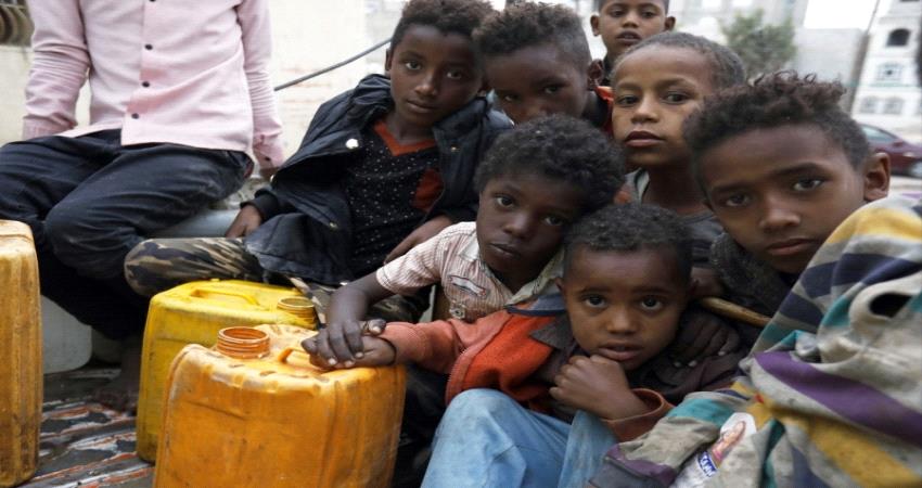 أطفال يحملون أوعية مياه بعد تعبئتها من إحدى المضخات، حيث إن نقص المياه يصيب أجزاء مختلفة من اليمن، وخاصة في مناطق سيطرة الحوثيين، بعد أن تضررت الخدمات بشكل كبير.