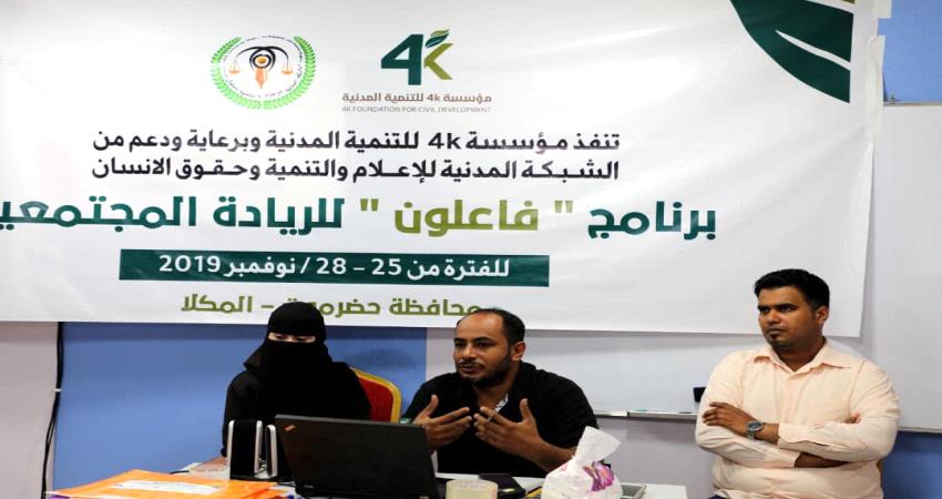 دشنت مؤسسة 4k للتنمية المدنية صباح اليوم، البرنامج التدريبي " فاعلون " للريادة المجتمعية، والتي تنفذها برعاية ودعم من الشبكة المدنية للإعلام والتنمية وحقوق الانسان خلال الفترة من 25 – 28 نوفمبر 2019، بقاعة معهد توب ارب بمديرية المكلا بمحافظة حضرموت.