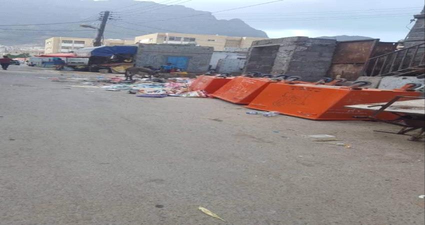 الصورة يظهر فيها براميل او مكبات قمامة في احد شوارع المعلا وهي في وضعية غريبة لم يكن الغرض من عملها بهذا الشكل .