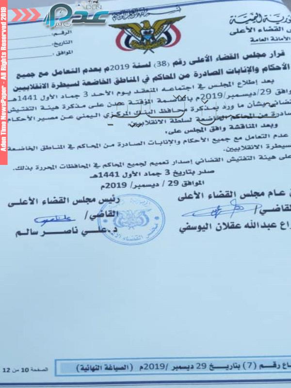 اصدر مجلس القضاء الاعلى قرار يقضي بمنع التعامل مع الاحكام القضائية الصادرة بمحاكم الانقلابيين ووجه المجلس هيئة التفتبش القضائي باصدار تعميم للمحاكم والنيابات في المناطق المحررة بمنع التعامل مع الاحكام الصادرة من قبل الحوثيين.