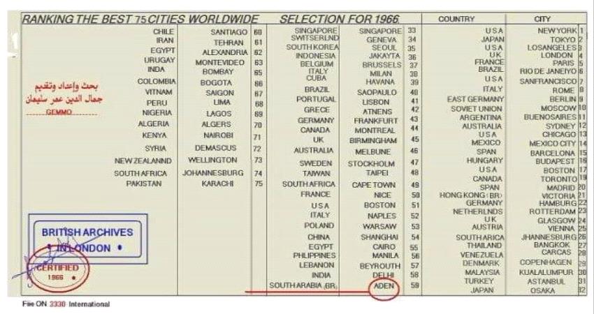 تداول نشطاء وثيقة لافضل 75 مدينة في العالم، لعام 1966م، حازت عدن فيها على المرتبة الثالثة عربيا والمرتبة 59 عالميا.