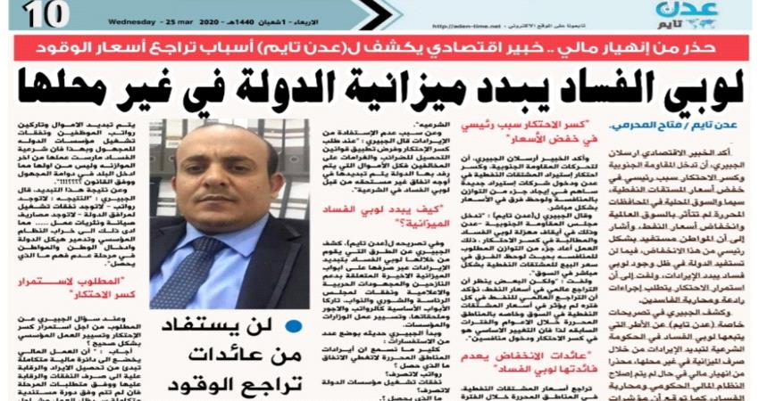 وكشف الجبيري في تصريحات خاصة (عدن تايم) عن الأطر التي يتبعها لوبي الفساد في الحكومة الشرعية لتبديد الإيرادات من خلال صرف الميزانية في غير محلها، محذرا من انهيار مالي في حال لم يتم إصلاح النظام المالي الحكومي ومحاربة الفساد، كما توقع أن مؤشرات العملة ستبقى رهن المضاربة خلال الفترة المقبلة.