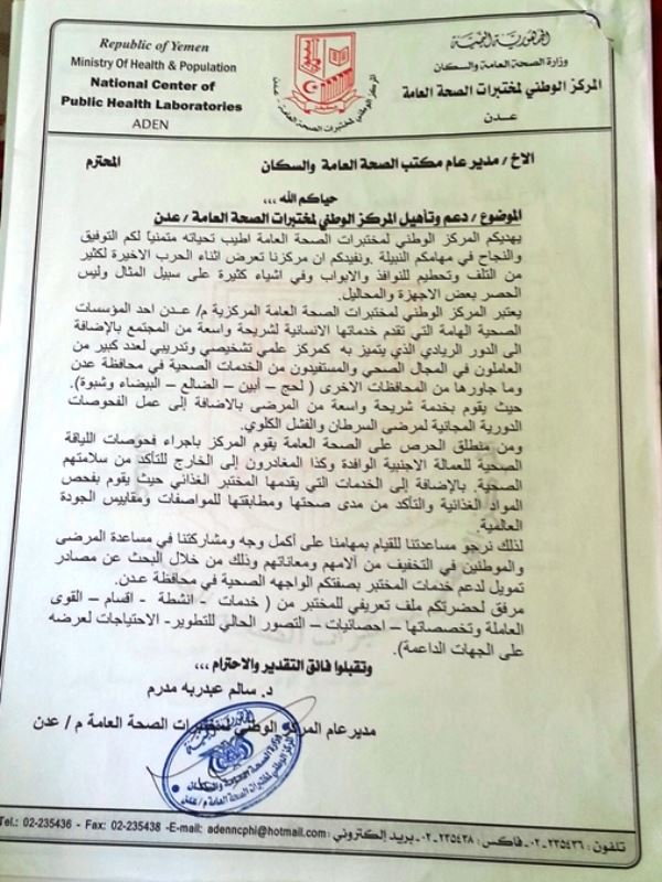واضاف مدرم انهم في المركز قد وجهوا رسائل الى كلا من الرئيس عبدربه منصور هادي، ومكتب الصحة في عدن من اجل مساعدتهم في استئناف العمل في مختبر الأغذية والمياة وتنشيط العمل القائم في الاقسام الاخرى في المركز والى الان لم يحصلوا على تجاوب وتفاعل تلك الجهات.
