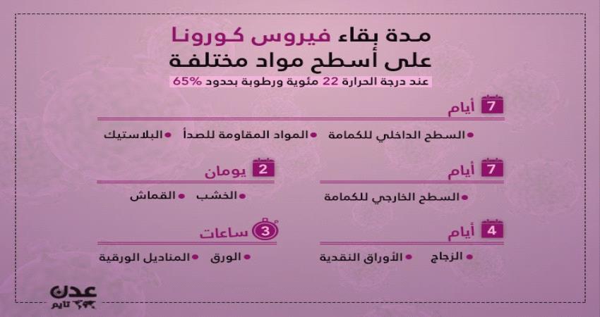 انفوجرافيك- مدة بقاء فايروس كورونا على الاسطح