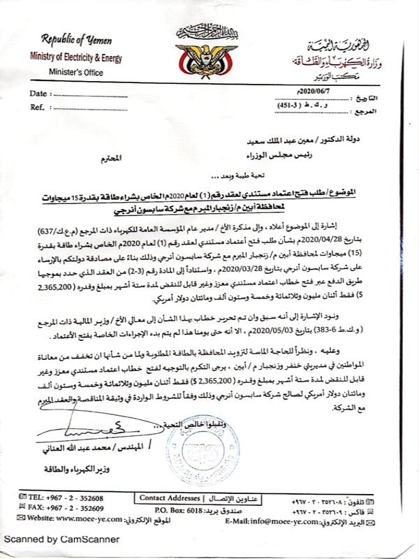 اما عدنان العدناني مسئول العلاقات العامة في شركة سابسون انرجي والذي تحدث حول موضوع محطة محافظة أبين والتأخير في بدأ التشغيل، حيث أوضح بأن الشركة قد قدمت كل الاشتراطات المطلوبة لتنفيذ العقد الموقع مع المؤسسة العامة للكهرباء وتم تقديم الضمان واستلمنا الموقع، ولكن هناك الفقرة ٢-٣ من العقد والتي تنص أن تقوم المؤسسة بفتح خطاب الاعتماد المستندي المعزز لشرط إنفاذ العقد، والذي لازلنا بانتظاره لهذه اللحظة.