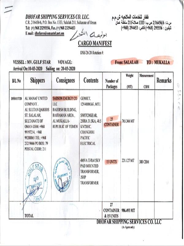 وأضاف العدناني بخصوص المعدات الجديدة التابعة لشركة سابسون أنرجي فما اطلعوا عليه من مولدات موجودة في الموقع وقد قمنا بتشغيلها وهذا ليس ملزما علينا ولكن تجاوبا لتخفيف المعاناة ورفع قدرة المحطة بعد إدخال هذه المولدات من (25) الى حوالي (34) ميجا حاليا، وشغاله، أضافه لباقي المولدات وعددها (26) مولد جديدة أخرى تبينها وثائق الشحن المرفقة والموجودة في مستودعات الشركة بمدينة المكلا وجاهزة للنقل حال التوقيع على العقد واستكمال الإجراءات لتنفيذه ، والتي يتطلب إخراج المولدات القديمة لضيق المساحة في الموقع الحالي ومكتظ بالمولدات بالوضع الحالي.