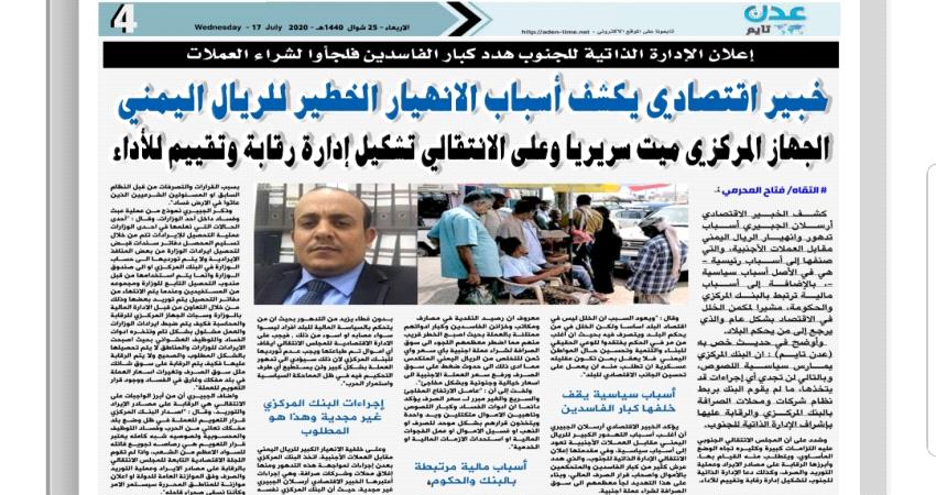 واضاف في حديثه ل(عدن تايم) : "ايضا البنك المركزي اليمني عدن لم يقوم بدوره كما هو مطلوب منه بحيث مارس سياسة الموت المالي من خلال غض الطرف وعدم التصرف تجاه السوق المالية ومحلات الصراف وهذه الحالة يعتبر وضعه وضع المحلل فقط بحيث يصدر قوانين ولا يطبقها او يراقب على تطبيقها وهذه تعتبر جريمة كبرى في حق هذا الشعب الذي يعاني من الحرب وتبعاتها بالإضافة الى المجاعة التي تفتك به".