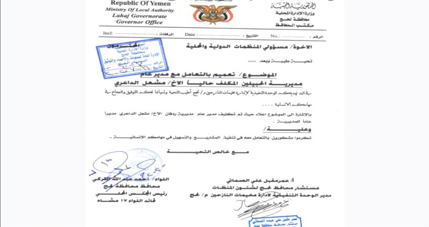 اصدر محافظ لحج احمد التركي تعميما المنظمات الدولية بالتعامل مع مدير مديرية الحبيلين الحالي مشعل الداعري لتسهيل مهامها.