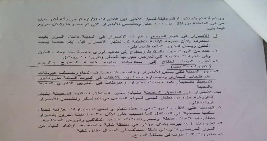 الأمر الآخر فإن الإحصائيات الأولية بمناطق المديرية عموماً فالحاجة أيضاً أكثر إلحاحاً في أن تضع السلطات رؤية تنفيذية عاجلة لإعادة أعمار ماتم من ضرر ، يضاف إلى مدينة شبام القديمة التعجيل باستكمال بنيتها التحتية ..