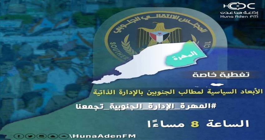 وأحتفت اذاعة هنا عدن بالفعالية الوطنية الهامة عبر تغطية مكثفة بدأت منذ مساء يوم الجمعة بحلقة خاصة بعنوان المهرة تستعد للمطالبة بالإدارة الذاتية رصد خلالها استعدادات الشارع المهري بالفعالية قدمها المذيع المتألق أيمن أمين حيث أستضاف كلا من حسان مهدي نائب رئيس القيادة المحلية للمجلس الانتقالي بمحافظة المهرة وفؤاد علوان رئيس الدائرة الإعلامية بالقيادة المحلية للمجلس الانتقالي الجنوبي بمحافظة المهرة وأ. خالد طه رئيس الدائرة الثقافية بالقيادة المحلية للمجلس الانتقالي بمحافظة المهرة بالاضافة الى أ. ناصر كريس رئيس الدائرة الجماهيرية للانتقالي المهرة.