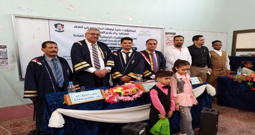 نال الباحث رضوان سلطان مقبل الخليدي درجة الماجستير بإمتياز من قسم الصحافة والإعلام كلية الأداب جامعة عدن على رسالته العلمية الموسومة ب: إستخدامات التقنيات الإتصالية في تطوير المادة الإعلامية المتلفزة : دراسة تحليلية لقناة السعيدة لعام 2018م ، بعد المناقشة العلنية التي شهدتها قاعة كلية الآداب جامعة عدن في خورمكسر بالعاصمةعدن، صباح يوم الثلاثاء1 سبتمبر 2020م.