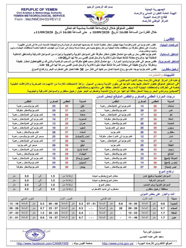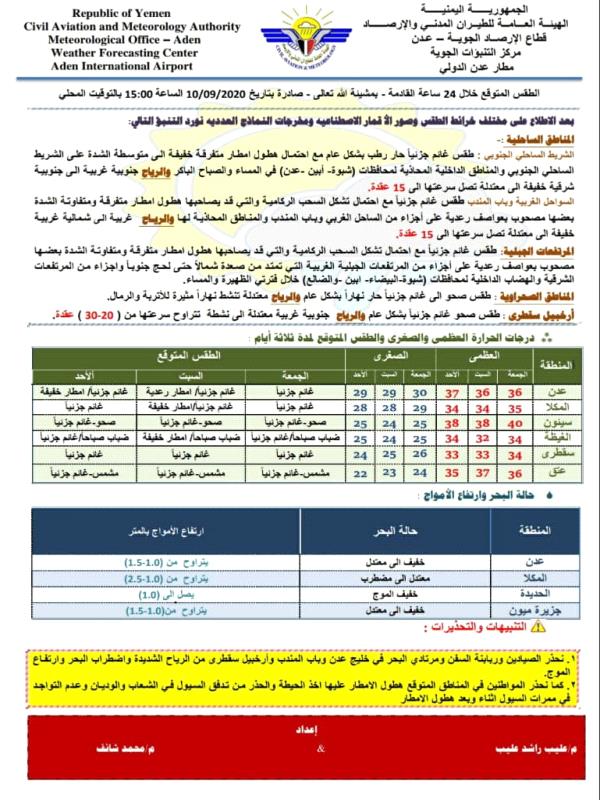 وفي المناطق الساحلية يتوقع ان تشهد طقس غائم جزئيا طقس حار ورطب مع احتمال هطول امطار متفرقة على السواحل الغربية والجنوبية واجزاء من السواحل الشرقية والمناطق الداخلية المقابلة لها ،والرياح معتدلة تنشط احيانا مثيرة للاتربة والرمال تصل اقصى سرعة لها الى20عقده .