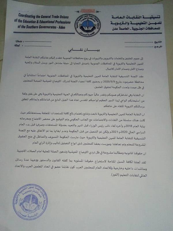 وأضاف البيان :" إن النقابة العامة للمهن التعليمية والتربوية تابعت وتتابع باهتمام بالغ كافة المستجدات المتعلقة بمستحقاتكم حيث كانت هناك سلسلة من اللقاءات والاجتماعات مع الجانب الحكومي وتم التوقيع على محضر الاجتماع ومخرجاته نهاية 2018م وآخره لقاء نائب رئيس الوزراء قبل أشهر والتعهد بجدولة المستحقات وصرفها قبل بدء العام الدراسي الحالي 2020م ولكن تم التنصل من قبل الحكومة وعدم ايفائها بما تم الإتفاق عليه مع اللجنة التنسيقية للنقابة العامة للمهن التعليمية والتربوية حيث ماؤست الحكومة التسويف والتماطل في منح الحقوق المشروعة للمعلم وتم تجاهلنا ومورست بحقنا كمعلمين شتى أنواع التضليل لتاليب وإثارة الرأي العام.
