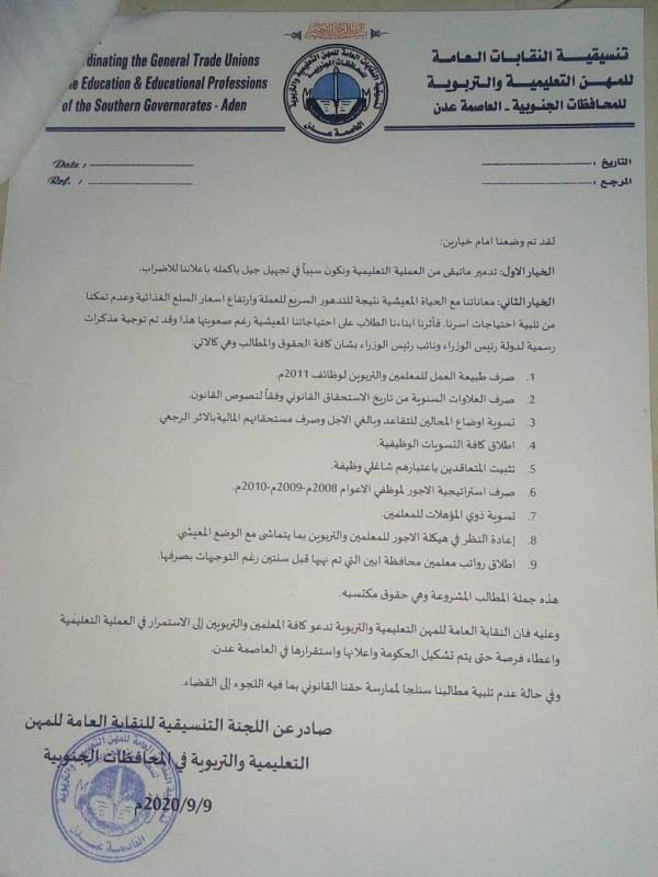 في ختام البيان ذكر:" النقابة العامة للمهن التعليمية والتربوية تدعوا كافة المعلمين والتربويين إلى الاستمرار في العملية التعليمية وإعطاء فرصة حتى يتم تشكيل الحكومة واستقرارها في العاصمة عدن وفي حالة عدم تلبية مطالبنا سنلجا لممارسة حقنا القانوني بما فيه اللجوء إلى القضاء.