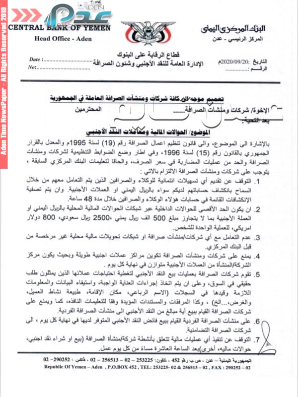 ونصت مذكرة صادرة عن البنك على تحديد سقف الحوالات المالية بـ ٥٠٠ الف ريال يمني، و ٢٥٠٠ ريال سعودي و ٨٠٠ دولار فقط.