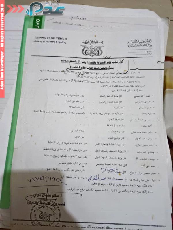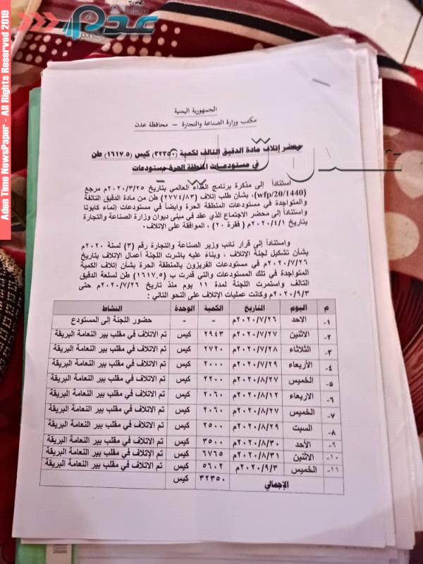 محدد فيه الكميات التي انتهت صلاحيتها والكميات المقربة صلاحيتها في 1.4.2020 واجتمعت قيادة الوزارة مع ممثلي البرنامج ووزارة التخطيط بشان طلب اتلاف كمية تقدر ب2774.83 طن منها 1617 طن في المتطقة الحرة والباقي موزع في مستودعات الصباري وانما والخضراء وبن مقيبل.