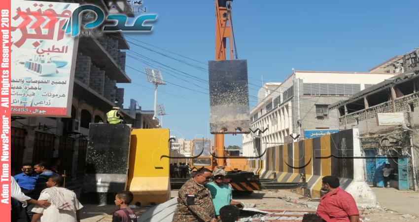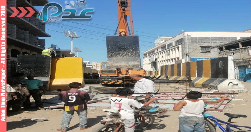بدأت ظهر اليوم عملية ازاحة حواجز أسمنتية كانت تغلق طريق رئيسي في محيط البنك المركزي بعدن، مغلق منذ اربع سنوات.
