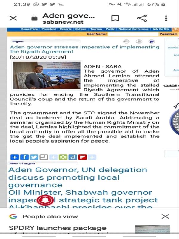 "محافظ عدن أ. احمد حامد لملس اكد أهمية تطبيق مخرجات اتفاق الرياض التي توفر لانتهاء انقلاب المجلس الانتقالي الجنوبي وعودة الحكومة للمدينة."