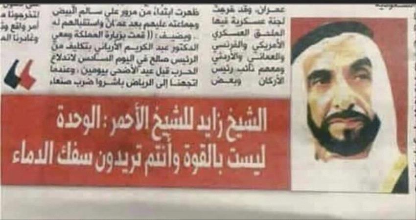 وقال المستشار في الغد المشرق أنور التميمي ان حكمة الشيخ زايد في الملف اليمني تجلّت عندما قالها مدوية لعبدالله الأحمر الذي زار ابوظبي ابان حرب94 في محاولة للتأثير على موقف الامارات ،قالها الحكيم:((فرض الوحدة بالقوة لا يدوم وسيجلب المتاعب وعدم الاستقرارللمنطقة)) وقد أثبتت الأحداث صواب رؤيته.