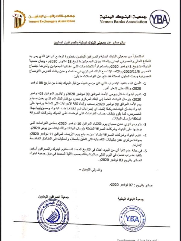 اعلنت ما يعرف بجمعية البنوك اليمنية والصرافين اليمنيين مساء اليوم السبت، الغاء اضرابها الجزئي عن العمل والذي كان مزمع تنفيذه غدا الاحد.