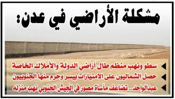 13. هناك مثلاً 15 شخص من المتنفذين الشماليين استولوا على مساحات واسعة في محافظة لحج تقدر ما يعادل 24% من مساحة محافظة عدن .
