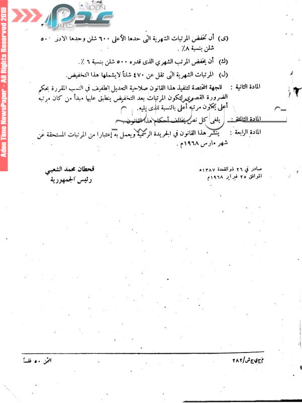 ويشير القانون الذي أصدره الرئيس قحطان الشعبي على سبيل المثال لا الحصر ان من راتبه يفوق على4001 شلن يخفض 2000 شلن وكذا بالنسبة للفئات الدنيا التي تصل الى 500 شلن تخفض بنسبة 6 % ، اما المرتبات تقل عن 470 شلن لا يشملها التخفيض.