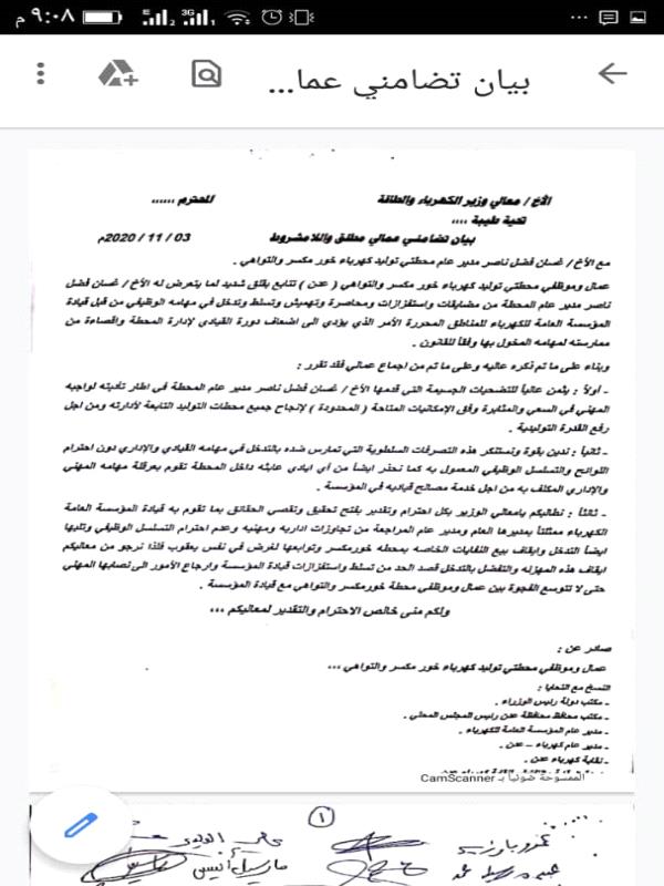 وكان عمال المؤسسة قد اصدروا قبل اسبوع بيانا تضامني مع مدير محطتي خورمكسر التواهي المهندس غسان فضل، ورفعوها لوزير الكهرباء والطاقة المهندس محمد العناني، ناشدوه فيها بالتدخل وايقاف المضايقات والقرارات التعسفية التي تطال مدراء المؤسسة وكوادرها الاكفاء.