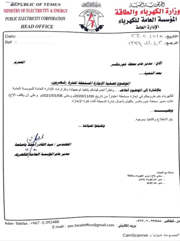 تفاجئ عمال وموظفو ومهندسو مؤسسة الكهرباء في مدينة عدن جنوب اليمن، اليوم الاحد بقرار صادم من مدير عام مؤسسة الكهرباء عبدالقادر باصلعة، اجبر فيه مدير محطتي خورمكسر والتواهي المهندس غسان فضل بالخروج في اجازة اجبارية ولمدة شهرين.