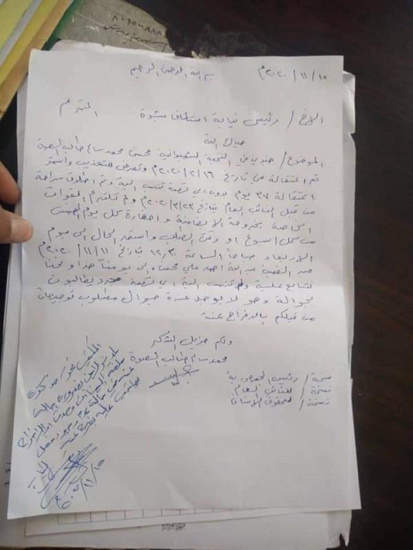 ابلغه فيها انه بنآ على الشكوى المقدمة اليه من محمد سالم الصوة والمتضمنة اعتقال ولده محسن محمد سالم من قبل القوات الخاصة بمحافظة شبوة بتاريخ 2020/2/16م وتم اطلاق سراحه بعد 37 يوم من اعتقاله الا انه افاد بان اطلاق سراحه بالضمان لاحضاره كل يوم خميس من كل اسبوع واستمر الحال حتى تاريخ 2020/11/11م بحجه تسليم جواله للقوات الخاصة ( مرفق صورة من الشكوئ) .