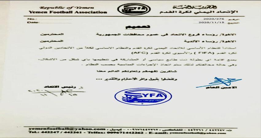 اصدر الاتحاد اليمني العام لكرة القدم اليوم الاثنين تعميم يحذر جميع الأندية الرياضية وفروع الإتحاد في جميع المحافظات من المشاركة في اي بطولة ذات طابع سياسي.