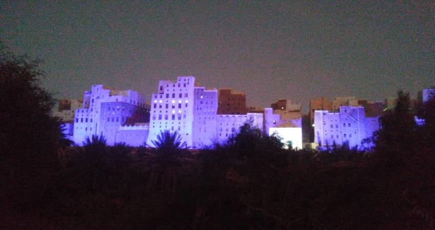 اتشحت الواجهة الغربية لمدينة شبام التاريخية بمحافظة حضرموت منذ ما بعد مغرب اليوم الجمعة باللون الازرق الذي اعتمد لثلاث معالم في اليمن.