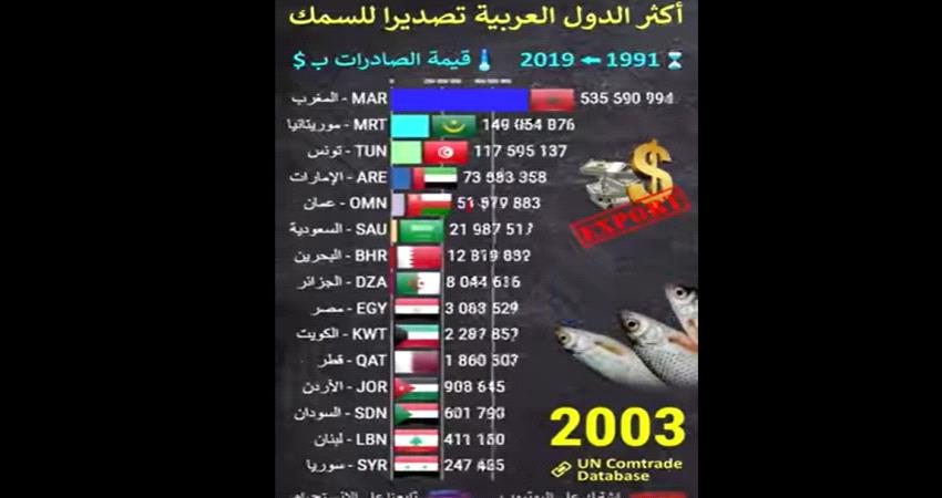 يظهر تسجيل فيديو اكثر الدول العربية تصديرا للاسماك خلال الفترة 1991_2019 وتصدرت اليمن المرتبة الثالثة حتى 2015 بعدها تحتل ذيل القائمة