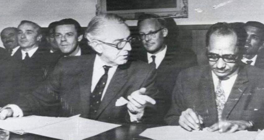 صورة لرئيس وفد الجبهة القومية قحطان محمد الشعبي واللورد شاكلتون رئيس الوفد البريطاني خلال التوقيع على محاضر المفاوضات.