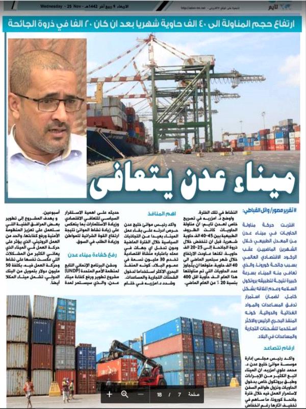 واكد رئيس مجلس إدارة موسسة موانئ خليج عدن د. محمد علوي امزربه، ان الميناء اتبع الكثير من الإجراءات وطبق بروتكول خاص بدخول الحاويات ونزول طواقم السفن لاستمرار العمل فيه خلال فترة جائحة كورونا، ما ساهم في تخفيف اثارها رغم انخفاض النشاط في تلك الفترة.