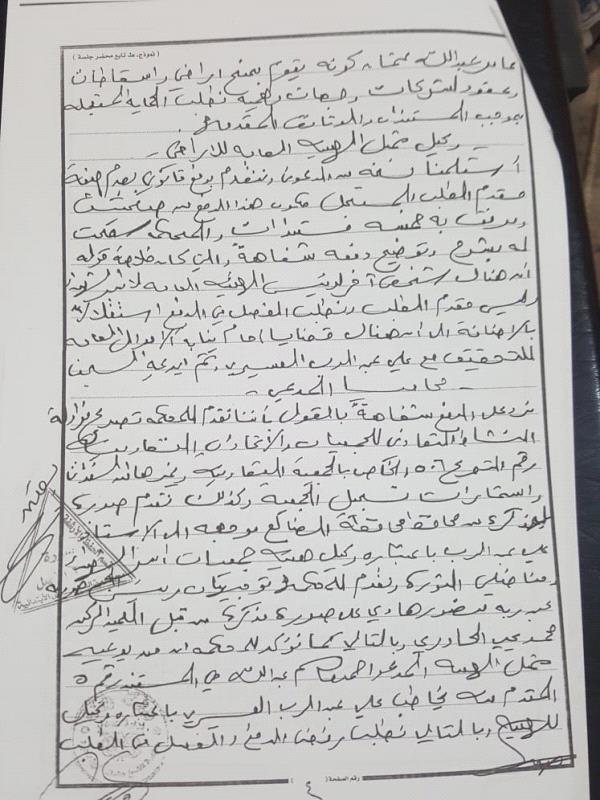 كما تقدمت الهيئة العامة للاراضي عبر ممثلها القانوني لمكتب عدن بدفعان الاول بعدم صفة الجمعية بتمثيل هيئة رعاية اسر الشهداء والثاني بعدم جواز تقديم الطلب المستعجل لوجود قضايا ضد الجمعية ورئيسها منظورة امام نيابة الاموال الابتدائية م/ عدن والتي بموجبها قامت نيابة الاموال باصدار امر حبس ضد رئيس الجمعية المدعو علي عبدالرب العسيري واودعته السجن الاحتياط لدى ادارة البحث الجنائي م/ عدن.