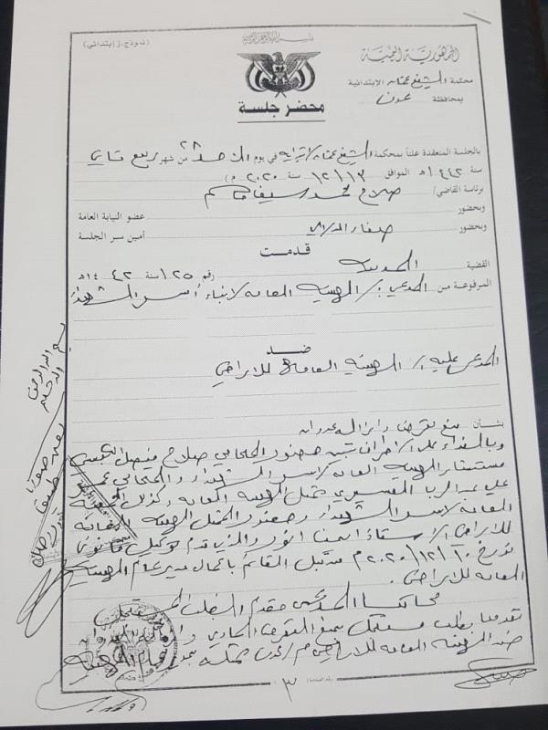 كما قام احد محاميين الجمعية بانتحال صفة مستشار هيئة رعاية اسر الشهداء المشكله بقرار جمهوري، وفي محضر الجلسة قدمت ما يؤكد شرعية الجمعية مستندا لترخيصها الصادر من مكتب الشؤون الاجتماعية والعمل والذي تم تجميدة وعدم تجديده.