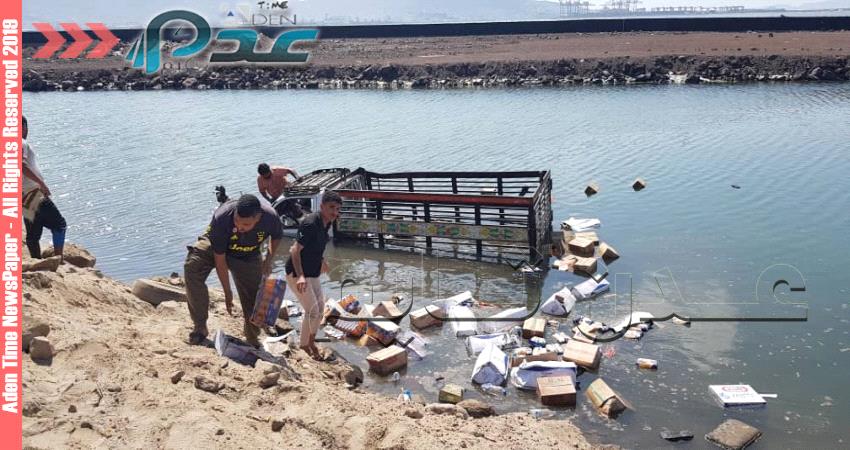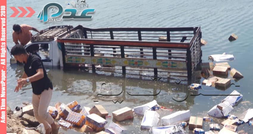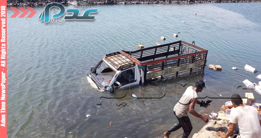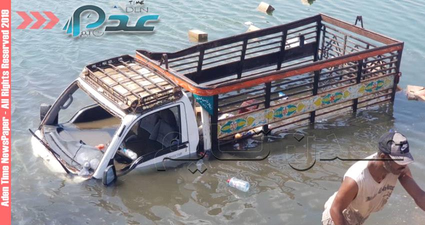 غاصت سيارة نقل بسبب السرعة الجنونية بحر طريق الجسر بالعاصمة عدن.