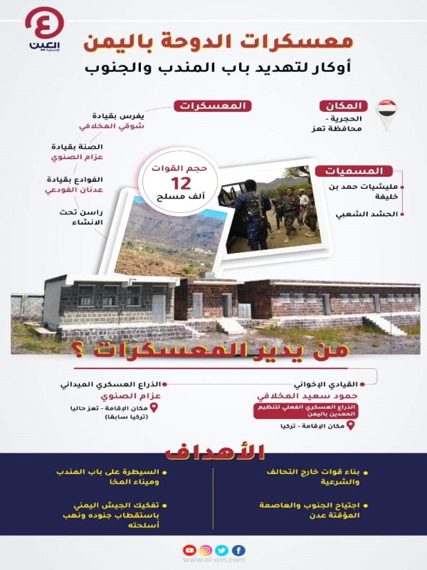 نشر موقع العين الأخبارية، عبر حسابه على فيسبوك، انفوجرافيك، عن معسكرات قطر (تنظيم الحمدين) في اليمن.