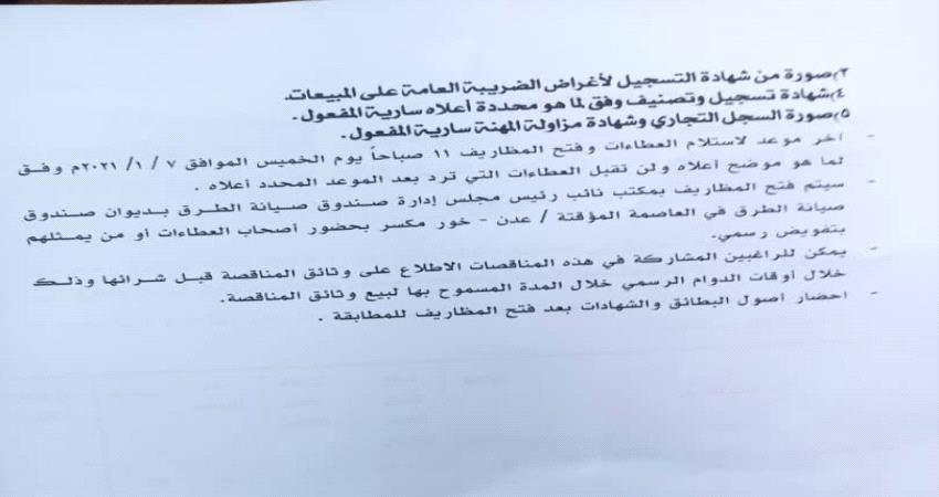 وقال الشيخ ياسر عبدالله العمودي مدير عام مديرية رصد يافع ان المناقصة جرت قبل حوالي شهر وتم تمديدها بسبب عدم تقدم المقاولين للمشروع وتتضمن صيانة الطريق المسفلت الذي جرفتها السيول والذي جرى شقها بالسابق والتي تعتبر ضمن مشاريع الطرق الطارئة التي ينفذها صندوق صيانة الطرق بالجمهورية.