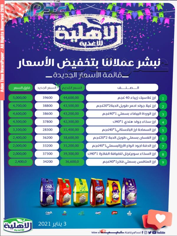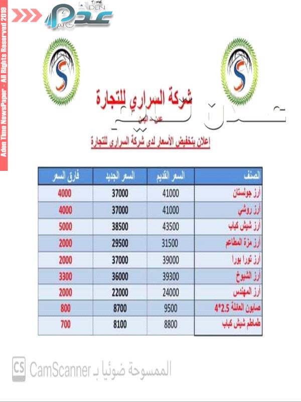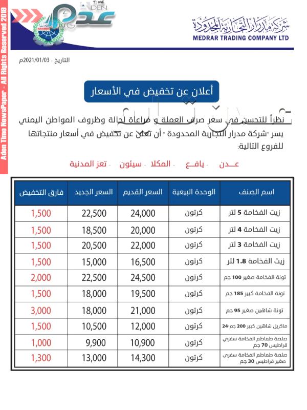 ومن بين الشركات التي أعلنت تنزيل اسعار المواد الاساسية "الأهلية للاغذية" و"مدرار التجارية" و"السراري للتجارة" وتنشر عدن تايم قوائم وزعتها الشركات الثلاث .
