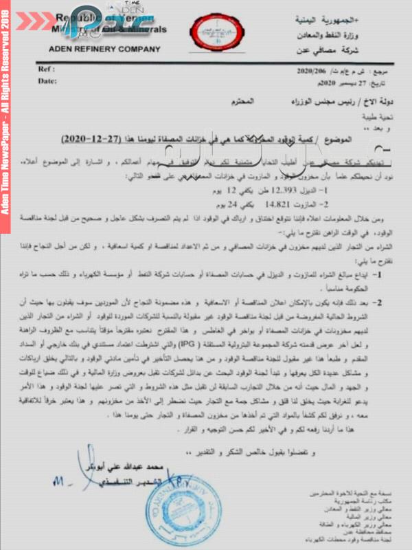 واوصت مصفاة عدن سابقا في مذكرة موجهه من مديرها التنفيذي محمد ابوبكر لرئيس الوزراء بالشراء مباشرة من التجار الذين لديهم مخزون في خزانات المصفاة او بواخر في الغاطس- في إشارة إلى تاجر النفط احمد العيسي- خارج الية المناقصات.