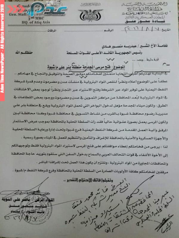 تكشف وثيقة خطاب رسمي للواء ناصر النوبة ابرز قادة الحراك الجنوبي السلمي وقائد محور عتق ، وجهه الى الرئيس عبدربه منصور هادي بشأن فتح مرسى المجدحة بئر علي بمحافظة شبوة لمواجهة نقص مواد مشتقات النفط في عدن وحضرموت والسماح بدخول بواخر وناقلات النفط عبر المجدحة في العام 2016م.