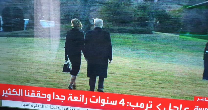 في هذه الاثناء تجري مراسم مغادرة رونالد تراكب البيت الأبيض من الحديقة الجنوبية للمرة الأخيرة.