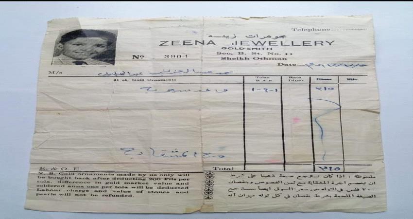 ونشر ناشط يدعى محمد عبدالعزيز في احدى مجموعات عدن زمان على فيسبوك، صورة لفاتورة بيع ذهب نقدا صادرة عن محل زينة للمجوهرات في مديرية الشيخ عثمان وتعود لشهر يوليو من العام 1967، اي قبل نحو 54 عاما من اليوم.