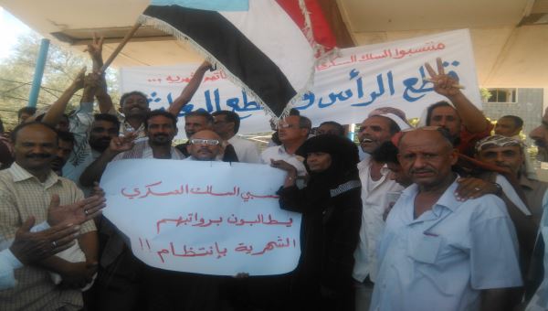 اعرب المئات وقادة في السلك العسكري والأمني من مختلف محافظات الجنوب عن إحتجاجهم على عدم صرف رواتبهم ومعاشاتهم منذ شهر أغسطس 2016 والبعض بدون رواتب لفترة خمسة أشهر .
