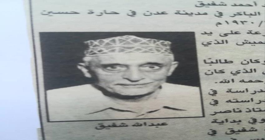 الهامة التربوية اليوم الاستاذ عبدالله محمد احمد شفيق قضئدى سنوات طفولته وصباه الباكر في مدينة عدن في حارة حسين الحارة العرريقة