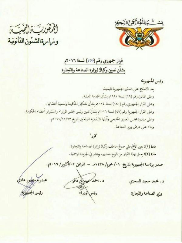 صدر القرار الجمهوري رقم 125 لسنة 2016 قضی بتعيين الاخ / علي صالح عاطف الشرفي وكيلا لوزارة الصناعة والتجارة