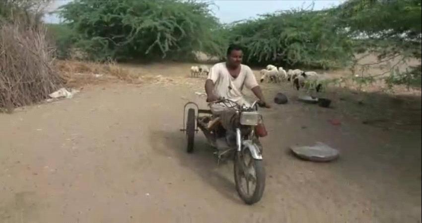 تحدى الإعاقة ويعمل على دراجة نارية.. "حسن علي" ضحية لغم حوثي افقده إحدى قدميه